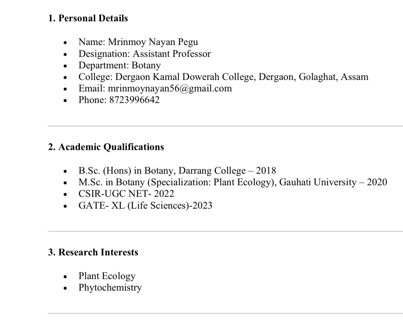 Academic Qualifications: B.Sc. (Hons) in Botany, Darrang College – 2018; M.Sc. in Botany (Specialization: Plant Ecology), Gauhati University – 2020; CSIR-UGC NET- 2022; GATE- XL (Life Sciences)-2023